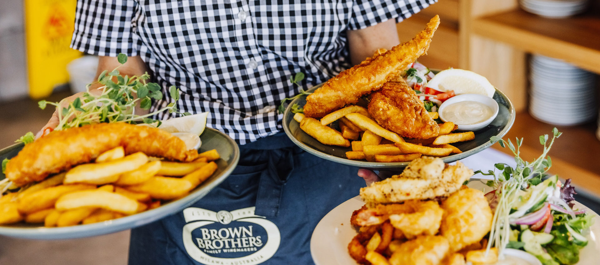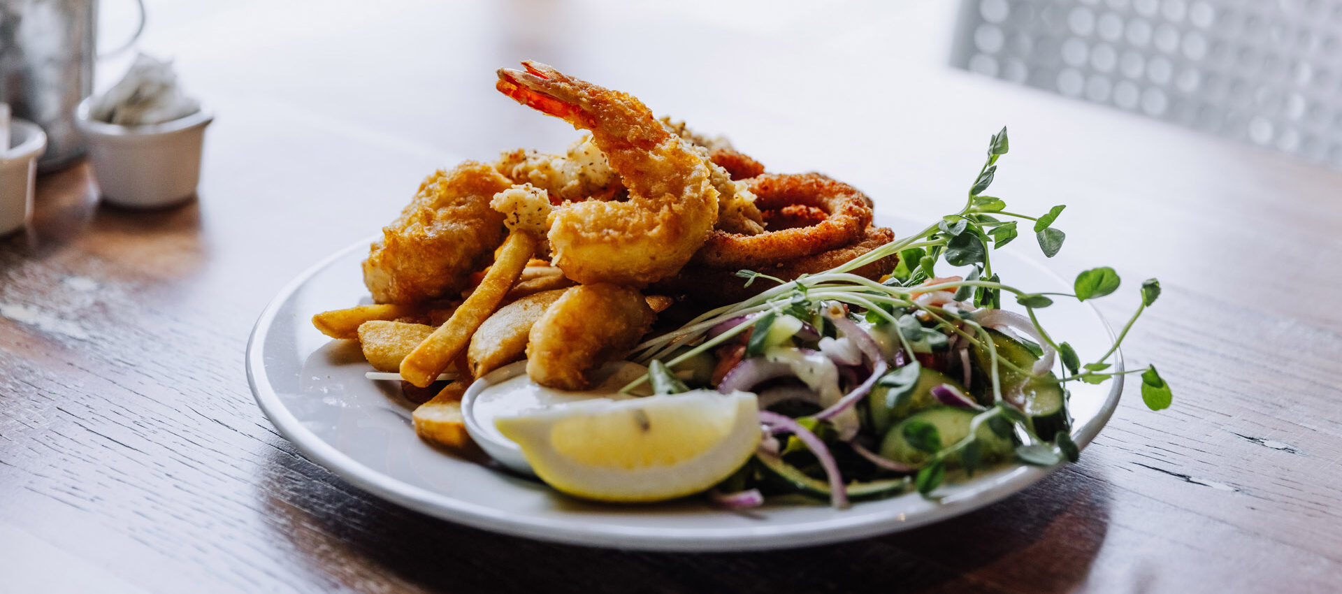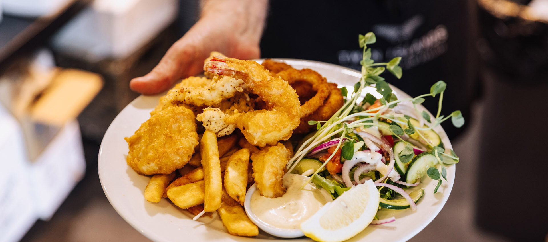 (pre-order) filled with seasonally available “Fruits of the Sea” - a selection of hot and cold (Prawns & Oysters, Bugs, Alaskan Crab Leg/s) seafood, including a GSM, with fresh fruit, chips, salad, sauces.